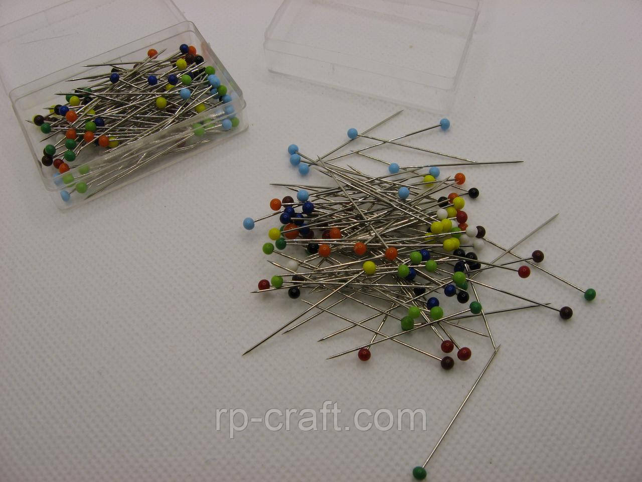Набір швейних шпильок. 100 штук у пластиковій коробці. 10 кольорів головок. Довгі-35 мм, гострі, зручні.